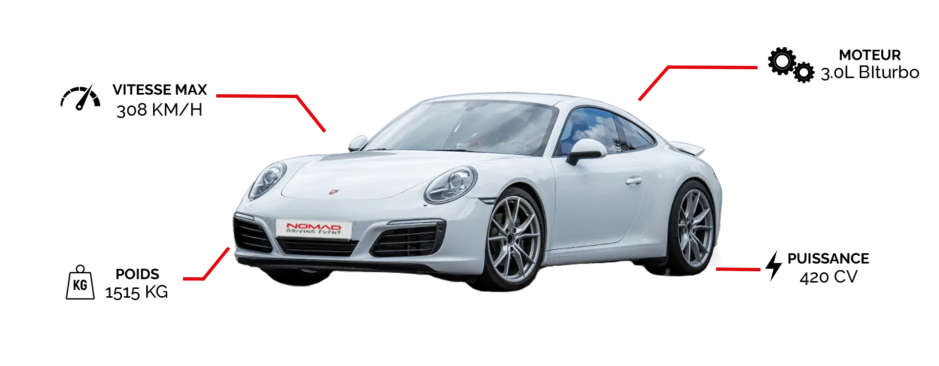 - Porsche 911 991 : équipée d’un moteur flat-6 de 3,4 L développant 350 chevaux, elle est capable d’abattre le 0 à 100 km/h en 4,6 secondes et d’atteindre plus de 285 km/h en vitesse de pointe. Grâce à son équilibre parfait et sa précision de conduite inégalée, la Porsche 911 991 transforme votre stage de pilotage en une expérience d’exception !