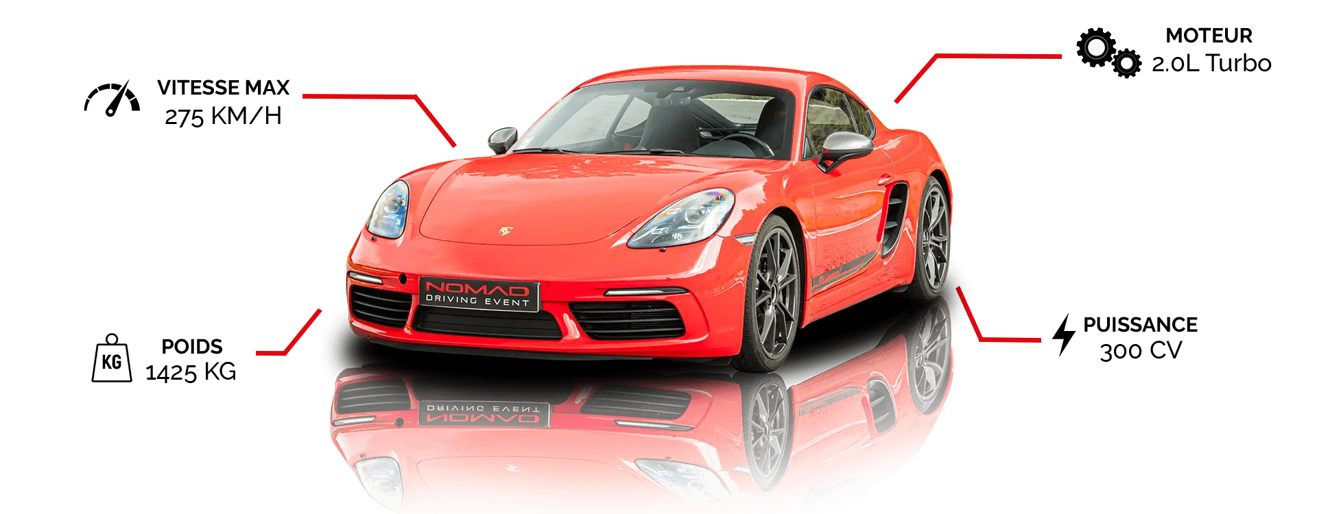 - Porsche Cayman T 718 : Avec ses 300 chevaux, son moteur flat-4 turbo et un châssis parfaitement équilibré, la Porsche Cayman T 718 vous offre des sensations pures sur circuit. Profitez d’un stage de pilotage unique et découvrez la précision redoutable de cette sportive, capable d’atteindre les 275 km/h et de réaliser le 0 à 100 km/h en seulement 4,9 secondes. La Porsche Cayman T 718 est le choix idéal pour vivre l’émotion Porsche dans toute sa splendeur.