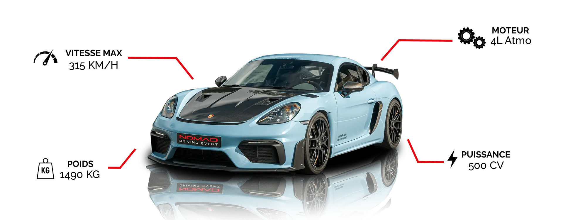 - Porsche GT4 RS : dotée d’un moteur flat-6 de 4,0 L développant 500 chevaux, capable d’atteindre le 0 à 100 km/h en 3,4 secondes et une vitesse de pointe de 315 km/h, la Porsche 718 Cayman GT4 RS, est un véritable concentré de performance. Conçue pour le circuit, la GT4 RS impressionne par sa légèreté, son aérodynamisme et son agilité exceptionnelle. Elle vous offre des sensations brutes et authentiques dignes des plus grandes sportives. Offrez-vous un stage de pilotage unique et vivez l’expérience Porsche dans sa version la plus radicale et émotionnelle !