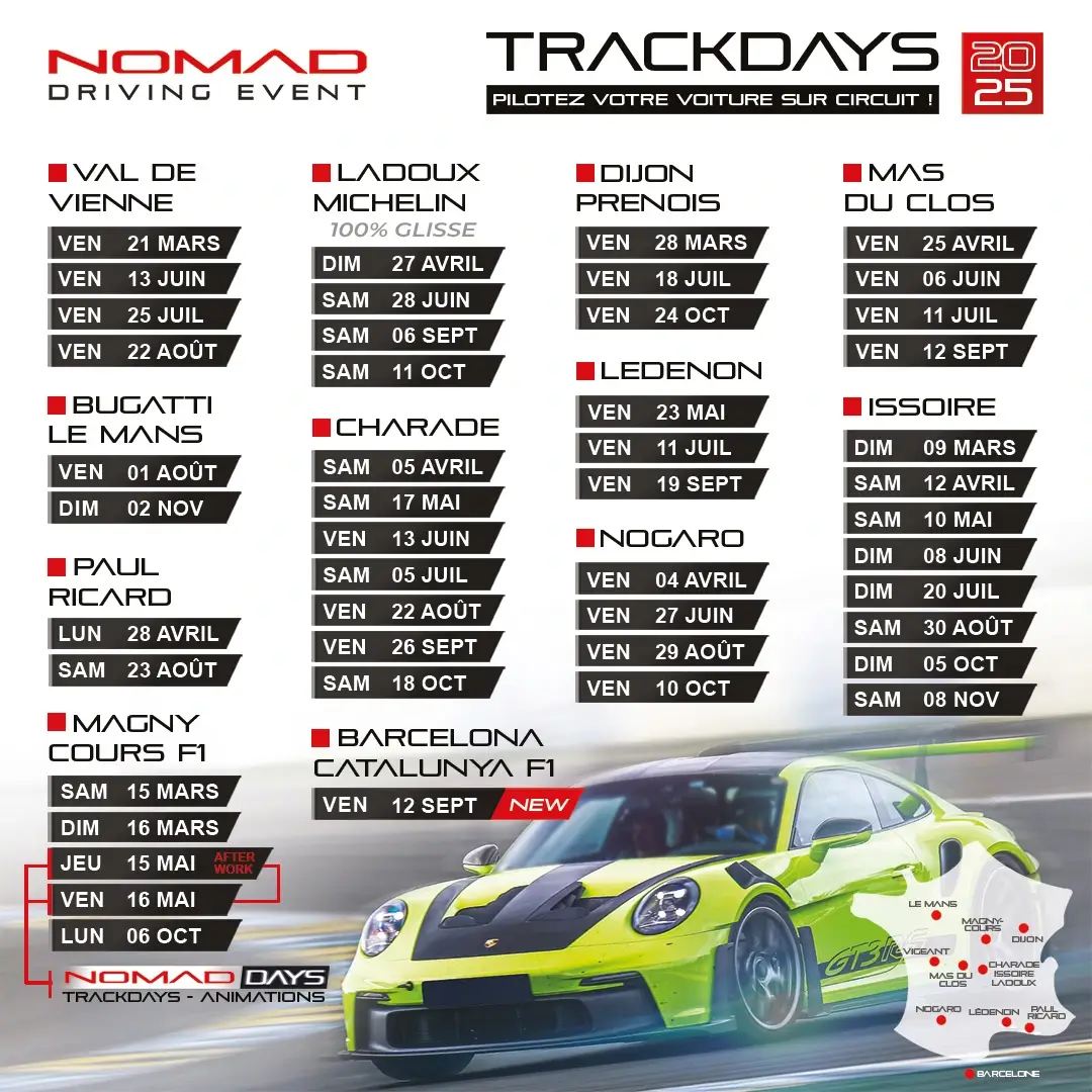 Nous organisons des track days sur différents circuits, tous aussi exceptionnels les uns que les autres. Les 4 km du circuit de Charade et ses 18 virages, les 2,5 km du circuit d’Issoire et ses 9 virages, les pistes d'essais Michelin de Ladoux (piste mouillée), les 4,4 km du circuit Grand Prix de Magny-cours et ses 17 virages, les 3,8km du circuit du Vigeant - Val de Vienne et ses 13 virages, les 3,6km du circuit Paul Armagnac de Nogaro et ses 13 virages, les 4,2km du circuit Bugatti du Mans et ses 11 virages, les 3,1km du circuit du Mas du Clos et ses 11 virages, les 3,8km du circuit de Dijon-Prenois et ses 12 virages, les 3,1km du circuit de Ledenon et ses 15 virages, les 5,8km du circuit Paul Ricard et ses 18 virages ou encore les 4,6km du circuit de Barcelone et ses 16 virages... Découvrez toutes leurs caractéristiques et faites votre choix en fonction de votre véhicule, du niveau technique et de la règlementation des circuits.
